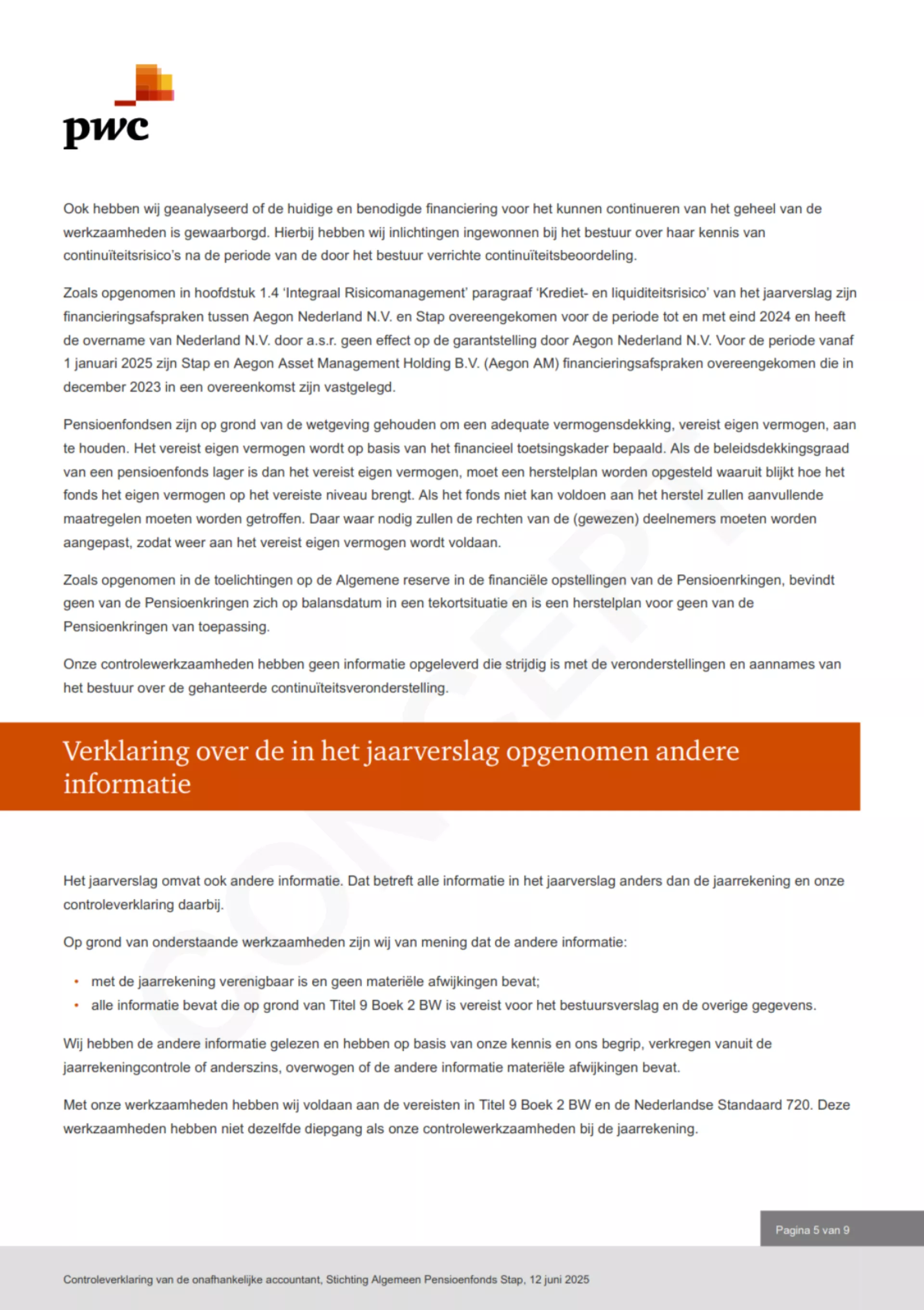 Met inachtneming van het voorafgaande heb ik mij ervan overtuigd dat is voldaan aan de artikelen 126 tot en met 140 van de Pensioenwet. Hierbij merk ik op dat op grond van overgangsrecht de artikelen 126 tot en met 140 van de Pensioenwet gelden, zoals deze tot de inwerkingtreding van de Wet toekomst pensioenen luidden.