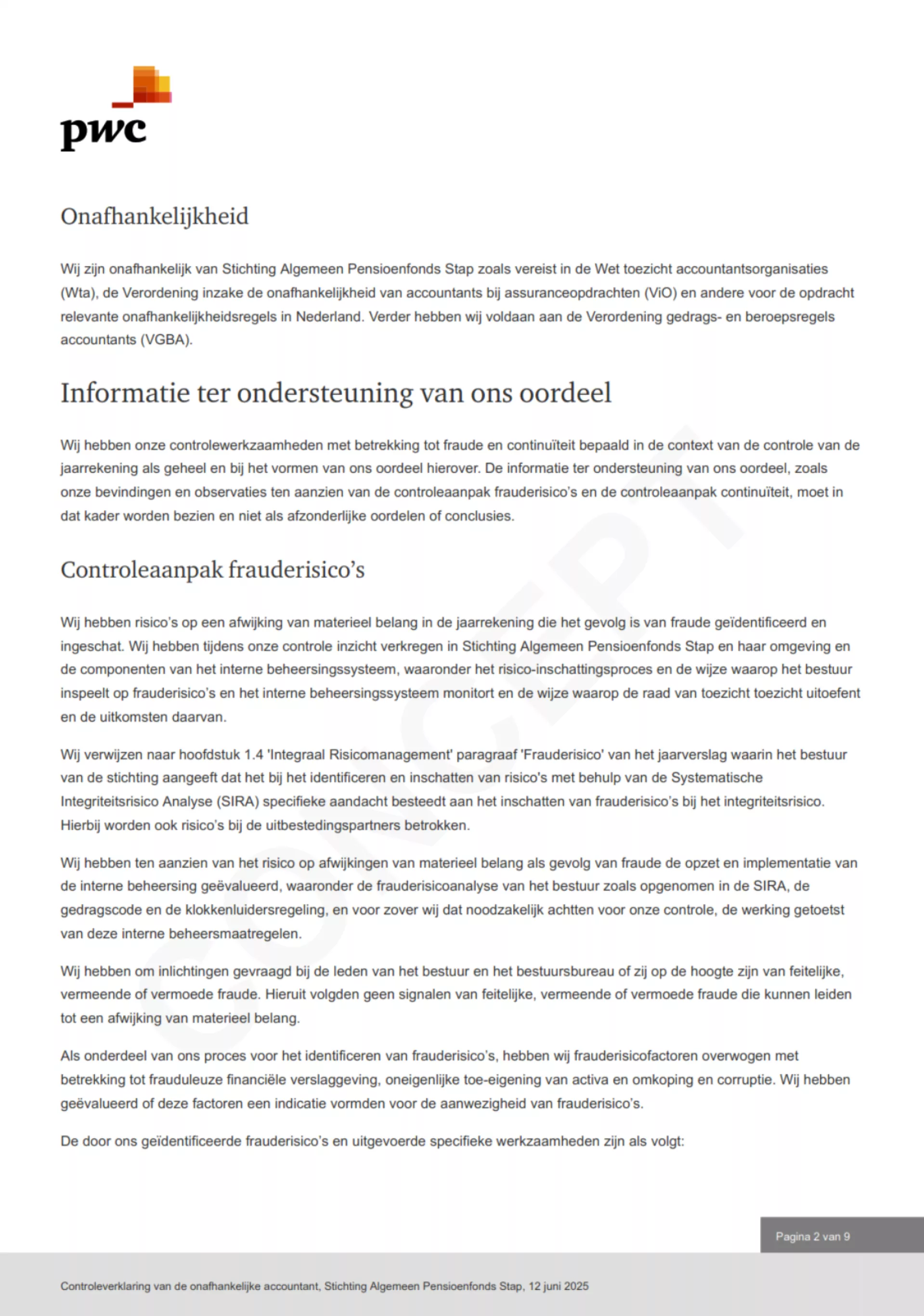 Als waarmerkend actuaris ben ik onafhankelijk van Stichting Algemeen Pensioenfonds Stap - Multi-Client Pensioenkring 2, zoals vereist conform artikel 148 van de Pensioenwet. Ik verricht geen andere werkzaamheden voor het pensioenfonds, anders dan de werkzaamheden uit hoofde van de actuariële functie.