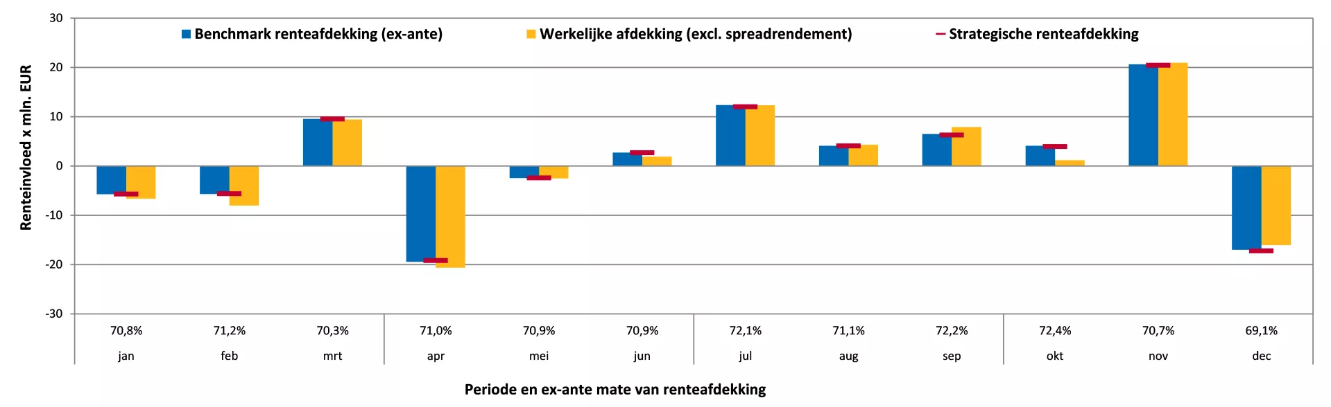 - De afdekking van het renterisico wordt maandelijks berekend door de rentegevoeligheid van de beleggingen te delen door de rentegevoeligheid van de verplichtingen.