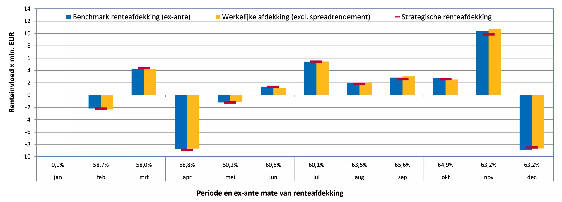 - De rode horizontale strepen tonen de strategisch gewenste mate van afdekking van het renterisico. De strategische mate van afdekking van het renterisico is afhankelijk van de huidige rentestand. Periodiek wordt gemonitord of de benchmark afdekking van het renterisico zich binnen de bandbreedtes rondom de strategische mate van afdekking van het renterisico bevindt.
