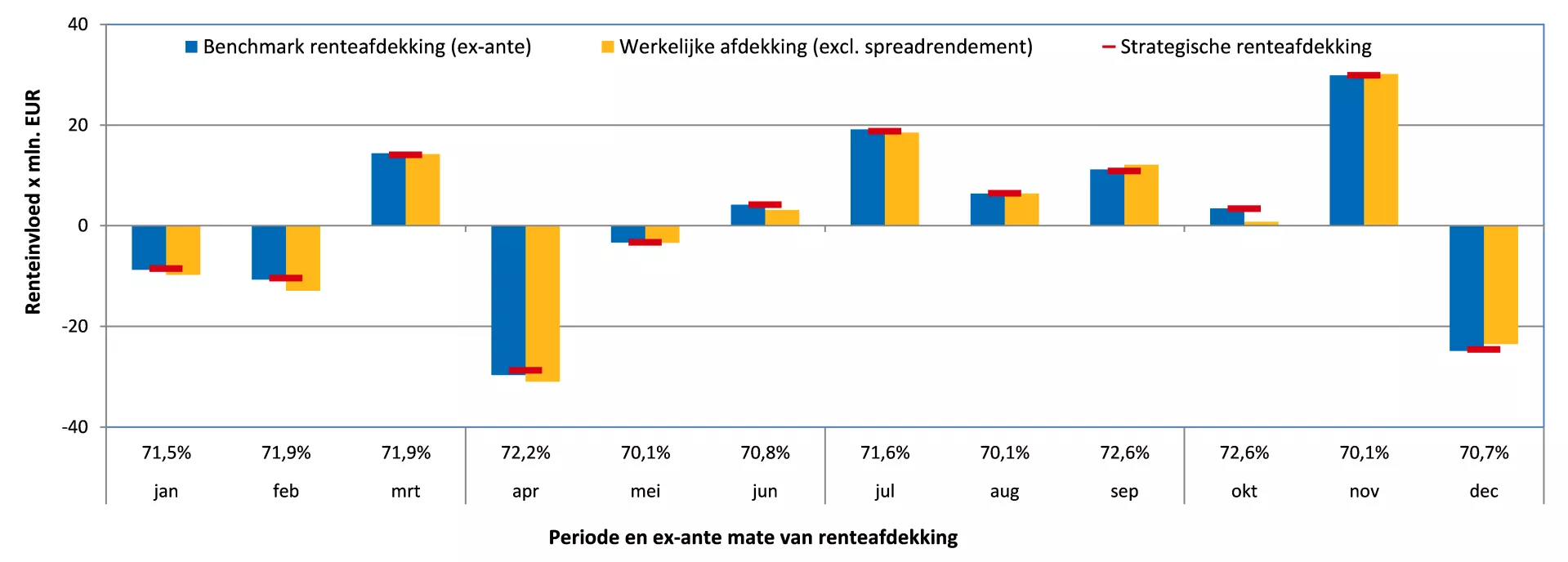 - De rode horizontale strepen tonen de strategisch gewenste mate van afdekking van het renterisico. De strategische mate van afdekking van het renterisico is afhankelijk van de huidige rentestand. Periodiek wordt gemonitord of de benchmark afdekking van het renterisico zich binnen de bandbreedtes rondom de strategische mate van afdekking van het renterisico bevindt.