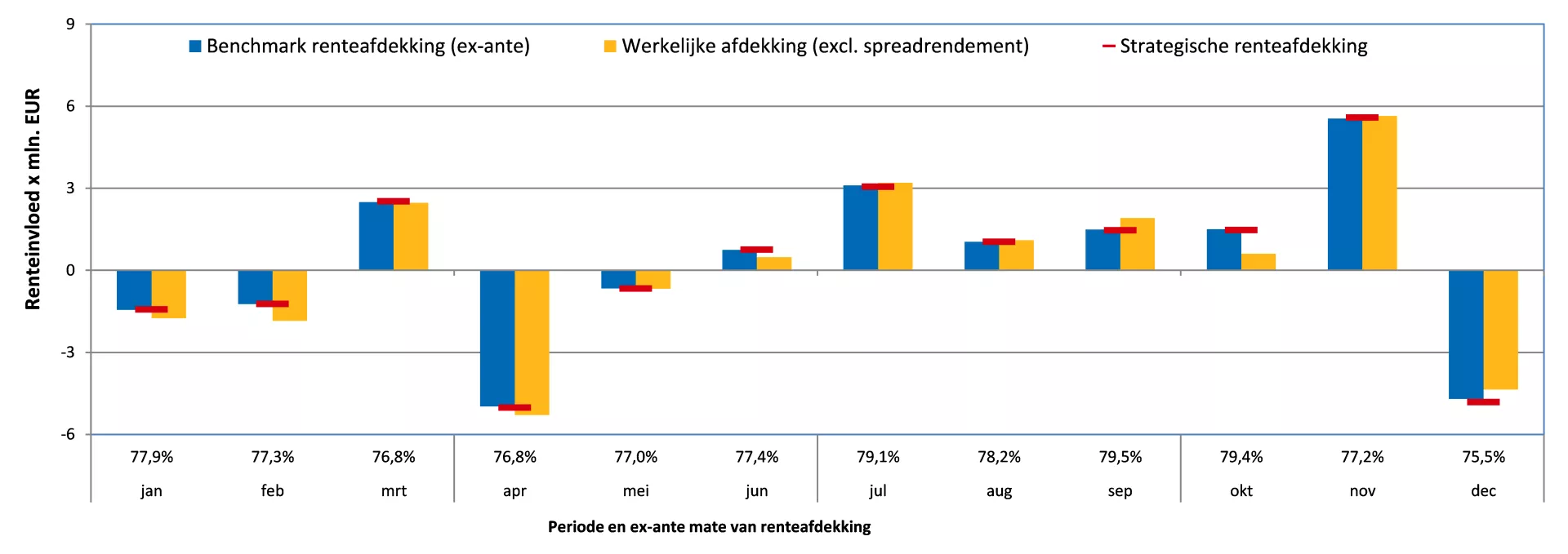 - De rode horizontale strepen tonen de strategisch gewenste mate van afdekking van het renterisico. De strategische mate van afdekking van het renterisico is afhankelijk van de huidige rentestand. Periodiek wordt gemonitord of de benchmark afdekking van het renterisico zich binnen de bandbreedtes rondom de strategische mate van afdekking van het renterisico bevindt.