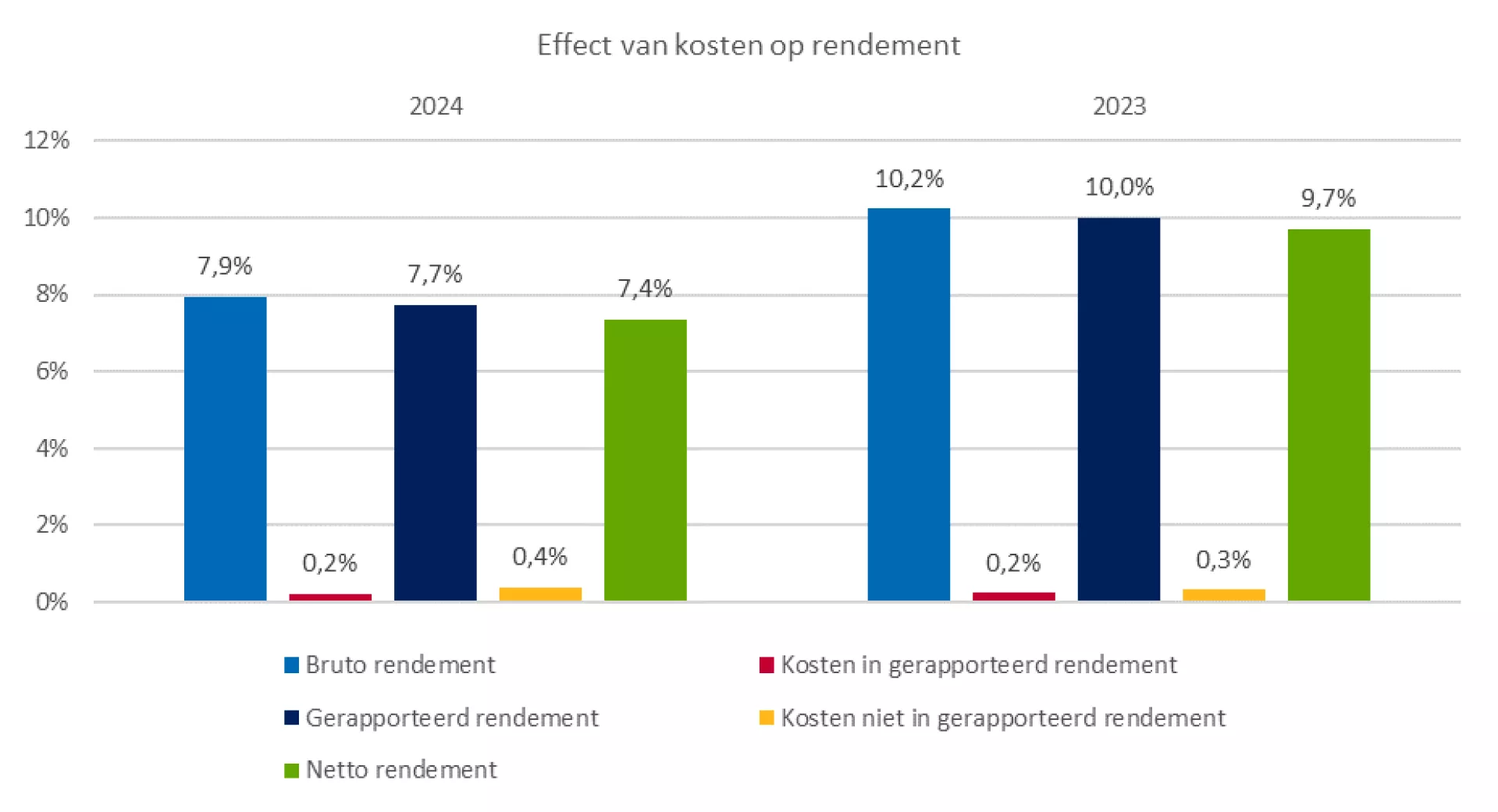 Het totale beleggingsrendement in 2024 bedroeg 7,7%. De categorie aandelen droeg 4,6% bij aan het totaalrendement, en de vastrentende waardes 2,3%. Verder leverde de overlay nog een bijdrage van 0,0%.